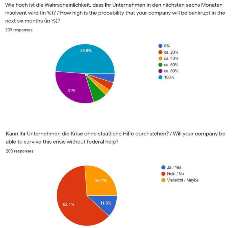 2020년 3월 31일부터 4월 3일까지 실시된 이 조사는 80%에서 90%가 정부 지원을 받지 않으면 향후 6개월 안에 파산할 가능성이 높다고 응답했다고 보고했다고 밝혔다.