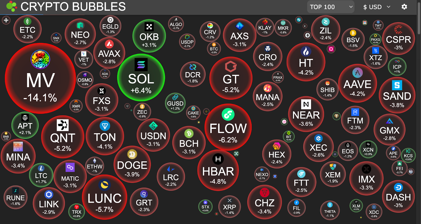 암호화폐의 대장격인 비트코인과 이더리움은 변동성이 거의 없이 지지부진한 흐름을 보였다. 비트코인은 오늘 개장보다 0.7% 하락한 채 거래되고 있으며, 이더리움도 개장가 대비 0.6% 가까이 하락한 채 거래되고 있다. 하지만 솔라나 거래는 변동폭이 큰 하루였다.