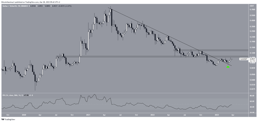 스텔라 가격은 2022년 12월 이후 상승했다. 그리고 사상 최고가 이후 유지되던 하강 저항선을 2023년 1월 돌파했고, 2023년 3월에는 지지선(녹색 아이콘)으로 복귀하여 지지선을 확인했다.