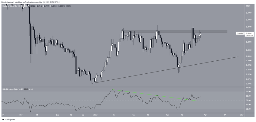 그 후 XLM은 또 다른 상승 움직임을 시작했다. 그러나 아직 0.105달러의 장기 저항 구간을 돌파하지 못했다. 또한 주간 RSI 또한 50을 돌파하지 못했다. 가격이 장기 강세 반전을 확인하려면 이 두 가지가 모두 필요하다.