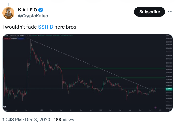 또, SHIB 커뮤니티는 유통량을 줄이기 위해 계속 토큰을 소각하고 있습니다. 11월에만 SHIB 13억 개가 소각됐습니다. 다만, 지난 24시간 동안, SHIB 소각량은 90% 감소했습니다. 암호화폐 분석가 크립토칼레오는 시바리움 네트워크 채택 급증과 토큰 소각을 가격 상승의 긍정적인 요소로 보고 있습니다. 그는 0.000016달러와 0.00002200달러를 중요한 상승 저지선으로 보고 있습니다.