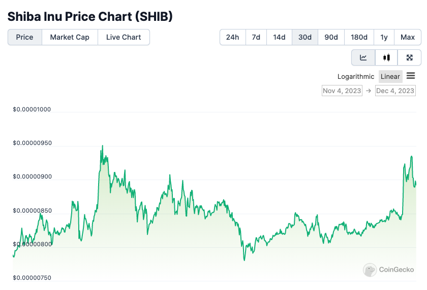 5일 오전 3시 기준, SHIB는 일주일 전 대비 9.4% 상승한 0.00000893달러를 기록했습니다.