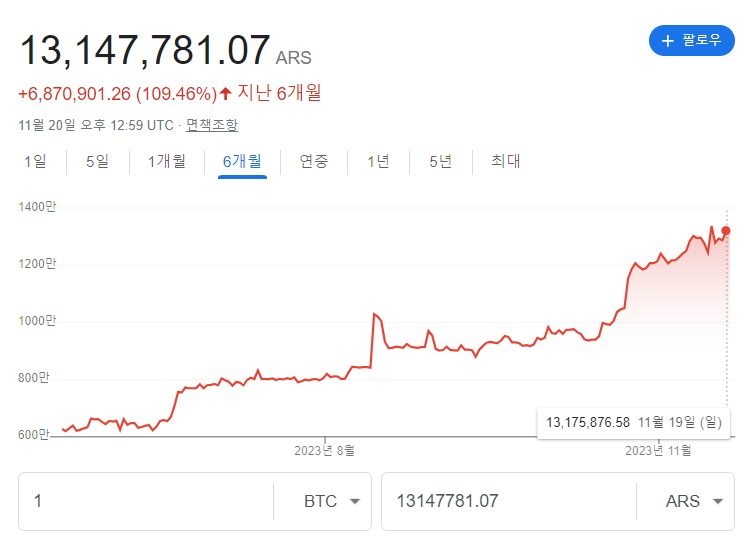 시장에 주는 영향 밀레이가 당선한 대선 날 아르헨티나의 비트코인 가격은 사상 처음으로 1300만 페소를 돌파했습니다. 인플레이션에 따른 통화 가치 하락 탓에 페소 기준 비트코인 가격은 지난 6개월 동안 100% 이상의 상승률을 기록한 상태입니다.