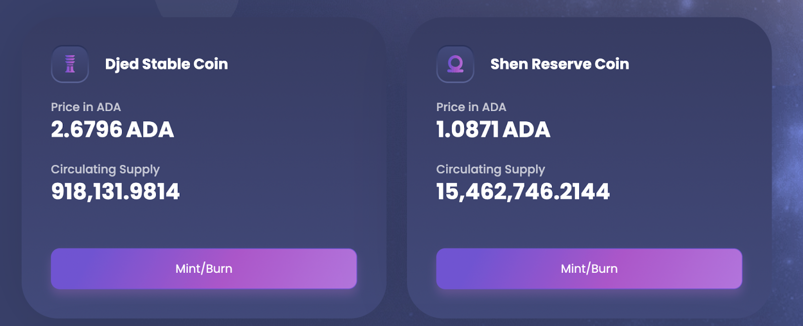 제드 공식 웹사이트에 따르면 현재 Djed와 Shen 가격은 각각 2.61ADA, 1.09ADA이며, 준비금 비율은 603%에 2663만 ADA가 예비된 것으로 확인된다.