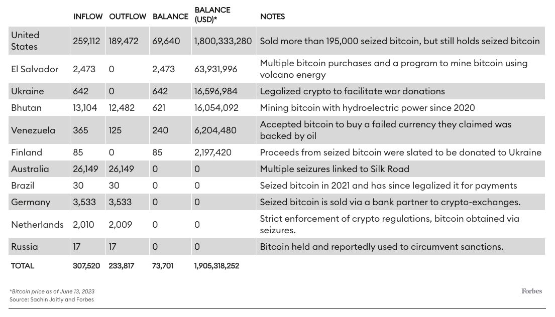 포브스는 2013년부터 2022년까지 주요 국가가 보유한 비트코인을 공개했다.
