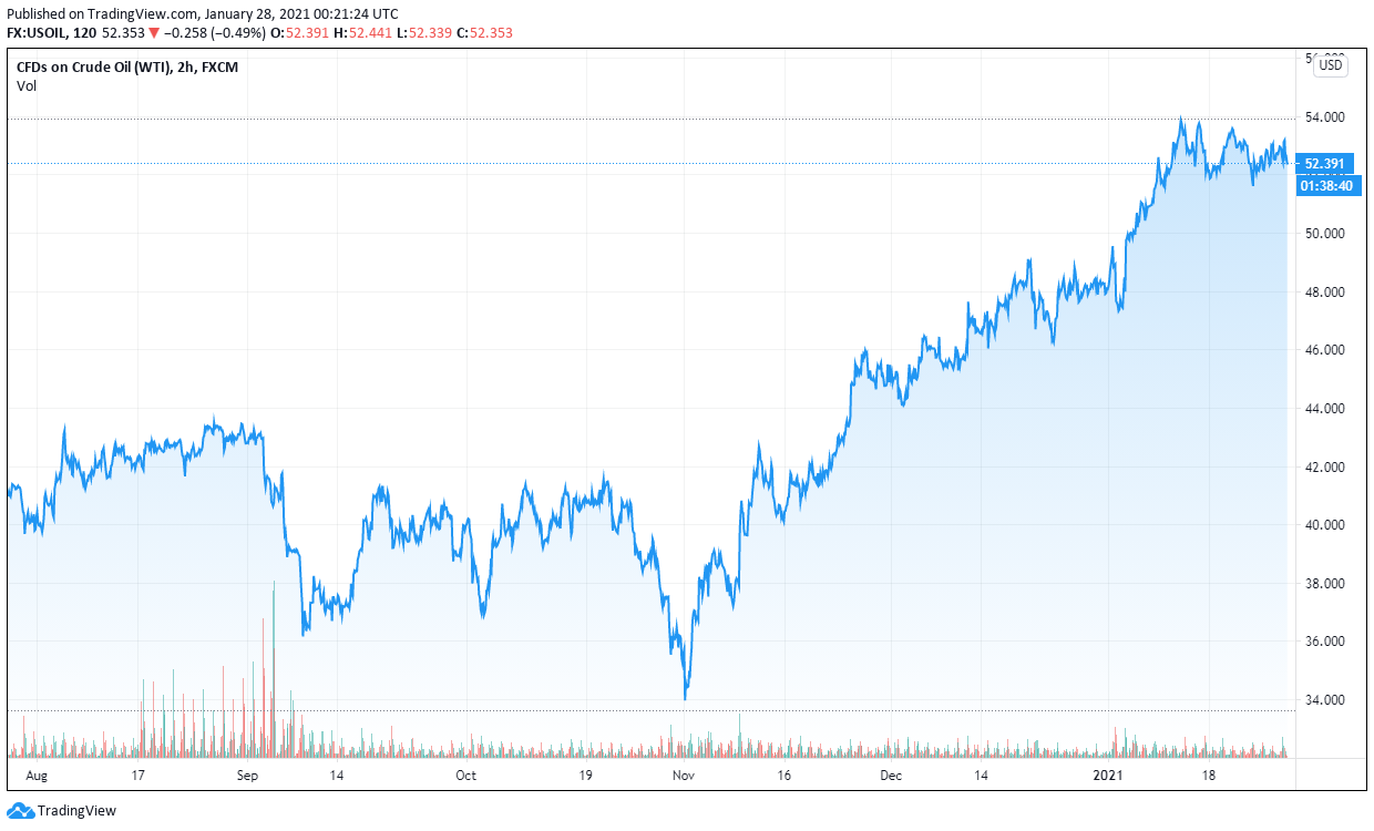 2020년 4월, 브렌트유 가격은 배럴 당 평균 $18까지 떨어져 1999년 2월 이후 월평균 가장 낮은 수치를 보였다. 전반적으로 318% 상승한 가격으로 지난해를 마감한 비트코인과 달리 WTI 오일은 22% 하락했다.