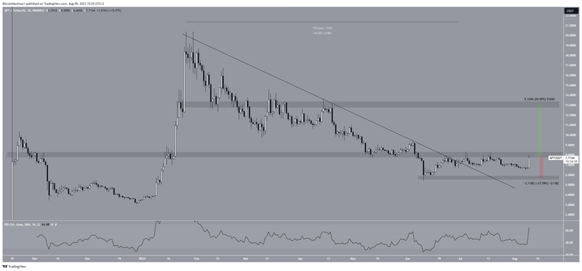 그러나 APT 가격은 상승세를 오래 유지하지 못했다. 8달러 저항선에서 거부당하며 돌파 수준 아래로 떨어졌다.