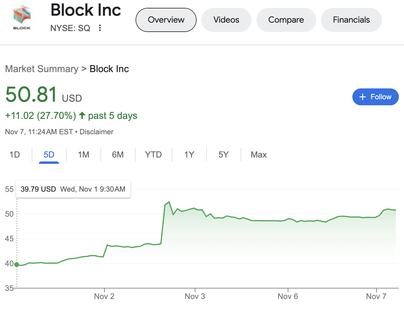 블록은 최근 주주 서한에서 비트코인 가격 상승과 모바일 결제 서비스인 캐시앱(Cash App) 사용량 증가로 수익이 늘었다고 밝혔습니다. 8일 블록은 50.81달러에 거래되고 있습니다.