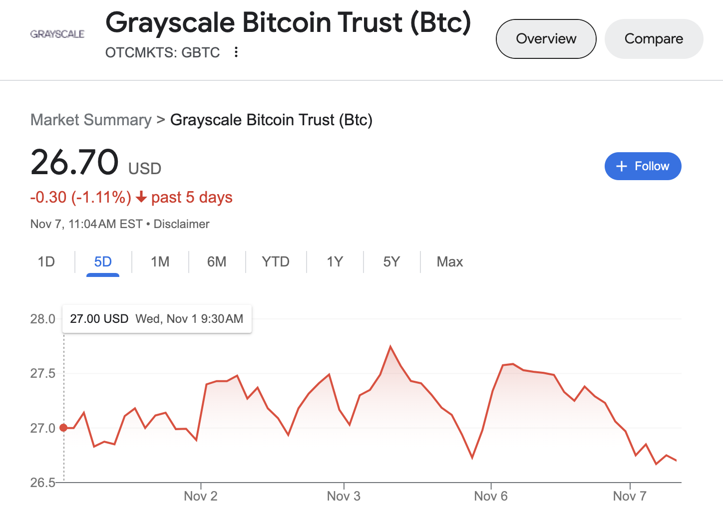 8일 그레이스케일의 주가는 26.70달러입니다. 지난 한 달 동안 약 30% 상승한 가격입니다. 주식 가격이 해당 비트코인 가치보다 얼마나 낮은지 나타내는 순자산가치 대비 GBTC 할인율은 2021년 12월 이후 처음으로 15% 미만으로 거래되고 있습니다. 그만큼 투자로 발생하는 차익이 줄었다는 것입니다.