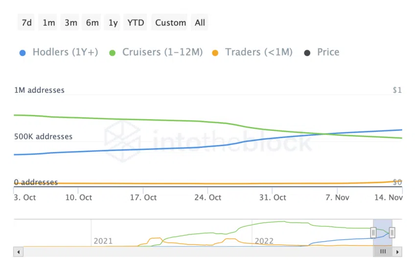 Sponsored특히 SHIB를 1년 이상 보유한 사람은 증가하는 가운데 중단기 보유자(1~12개월 보유)들은 줄어들고 있다. 그러나 초단기 보유자들은(1개월 미만) 지난 30일 동안 71.17% 증가했다. 반면 더 큰 가격의 변동은 코인 중단기 보유자 그룹이 주도하는 것으로 보인다.
