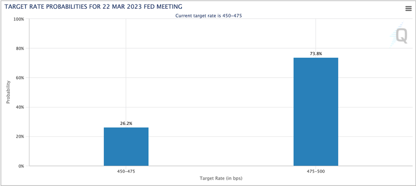 분석가들은 이번 달 FOMC 회의에서 금리 인상이 없을 확률을 26.2%로 점치고 있다.