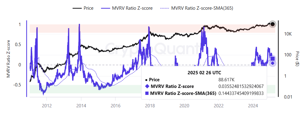 비인크립토 취재를 종합하면 암호화폐 온체인 데이터 분석 플랫폼 크립토퀀트의 Bitcoin MVRV Ratio Z-score 지표가 지난 26일 0.0355를 기록했습니다.