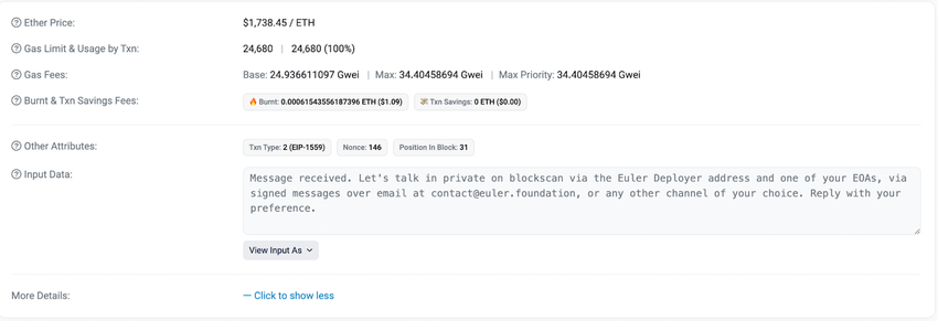 지난 16일 오일러 파이낸스의 마이클 벤틀리 CEO는 범인 체포 및 도난 자금 반환에 관한 정보를 제공해달라며 100만달러의 포상금을 걸었다. 사흘 뒤인 19일 “확실한 연결고리를 찾았다”고 주장하는 사람으로부터 블록체인 메시지를 받았다.