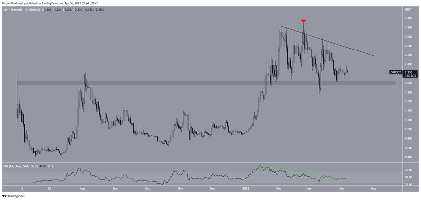 그러나 파동 수는 강세 전망을 제시하며, 4월에 역대 최고가에 도달할 것임을 시사한다. OP 가격은 이전 채널의 저항선에서 반등해 네 번째 파동 하락을 완료했다. 따라서 지금은 파동5(흰색)에 있을 것으로 보인다.