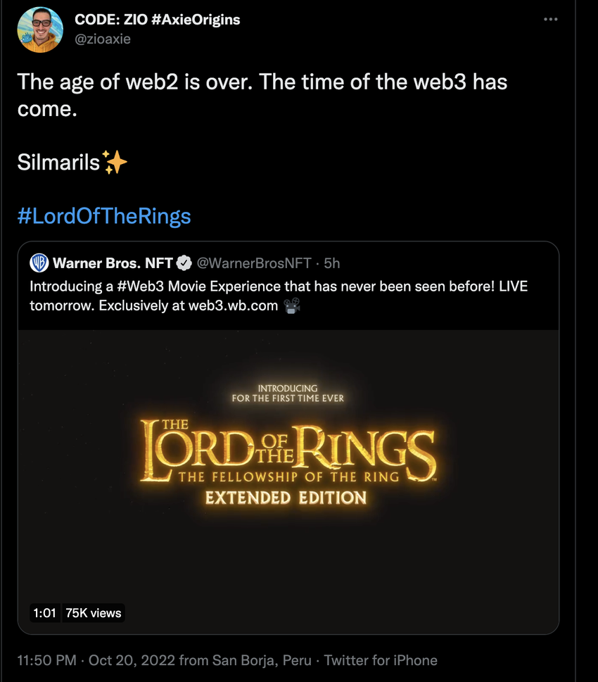 워너 브라더스 스튜디오는 ‘반지의 제왕: 반지 원정대’ NFT 컬렉션을 출시할 것이라고 발표했다.