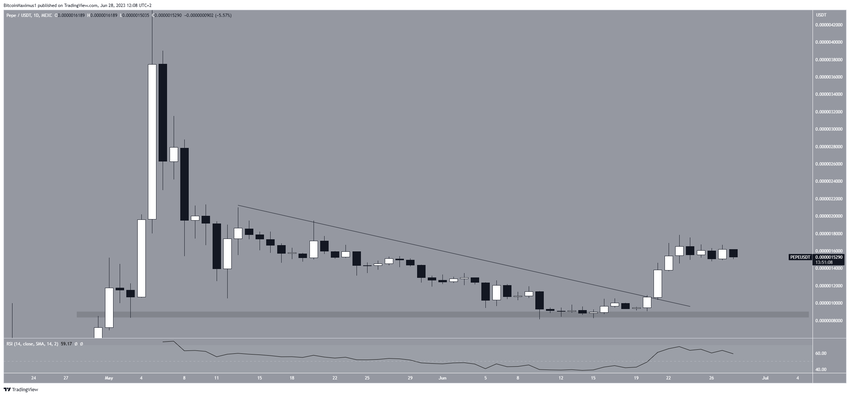 PEPE는 5월13일 이후 하강 저항선 아래로 하락했다. 이후 6월10일 0.00000081달러까지 떨어졌으나 반등해 0.00000088달러 영역을 지지선으로 확보했다. 6월21일 가격은 저항선을 돌파해 조정이 완료됐음을 확인했다. 하락 전 가격은 0.0000017달러로 최고치를 나타냈다.