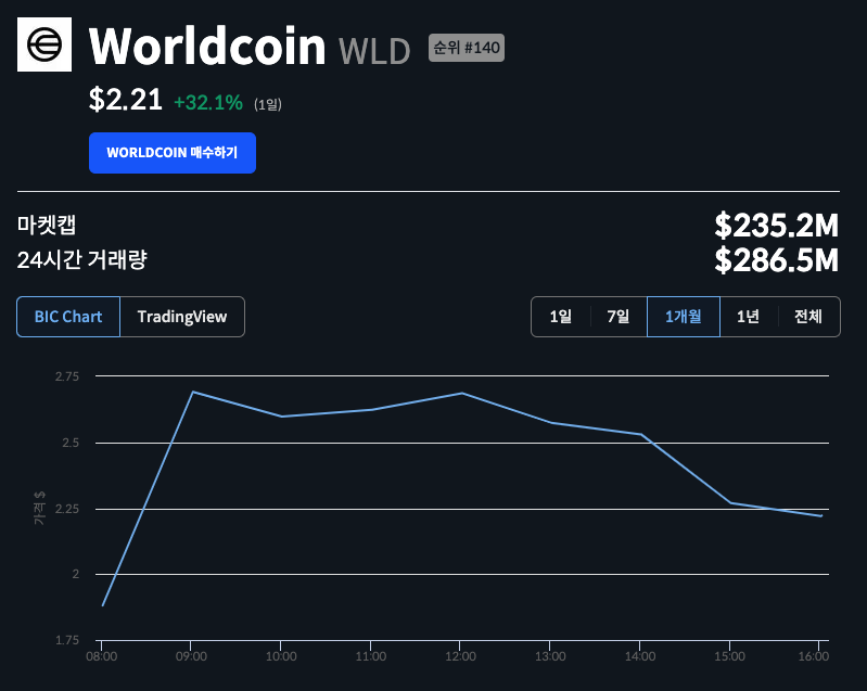 24일(현지시각) WLD이 가격 추이. 출처:비인크립토