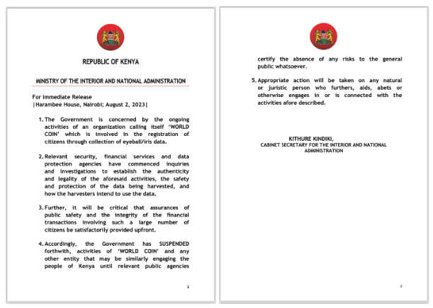 같은 날, 케냐는 “월드코인의 진실성과 합법성을 조사하기 시작했다”며 “당국이 인증할 때까지 서비스를 중단한다”고 밝혔다. 키투레 킨디키 케냐 내무장관은 페이스북을 통해 “월드코인의 활동을 돕거나 참여하는 모든 개인이나 법인에 적절한 조치가 취해질 것”이라고 경고했다.