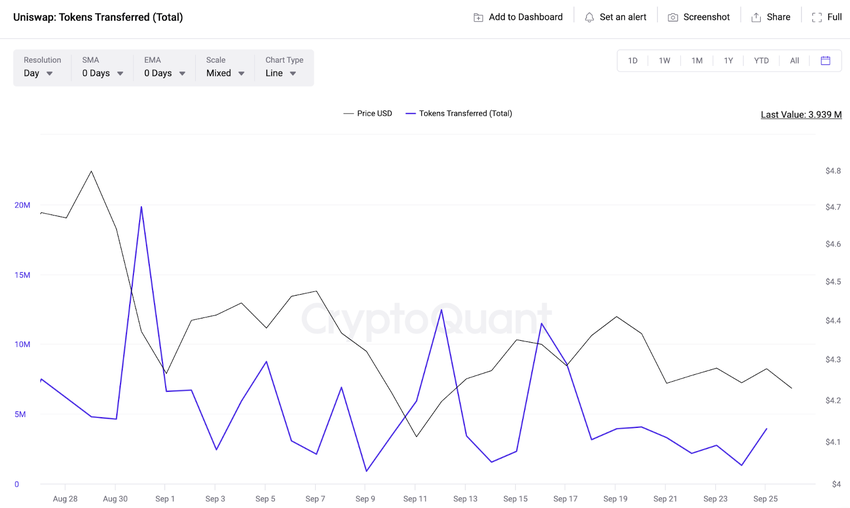 암호화폐 온체인 데이터 분석 기업인 크립토퀀트 자료에 따르면 지난 8월 말 거래소 지갑에 예치된 UNI 토큰은 총 4530만 개였으나 9월26일 현재 4702만 개로 나타났다.