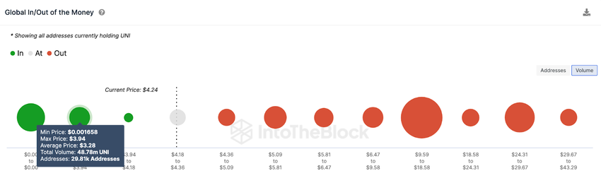 현재 UNI 투자자들의 구매가격 분포를 정리한 GIOM 지표도 이를 뒷받침한다.