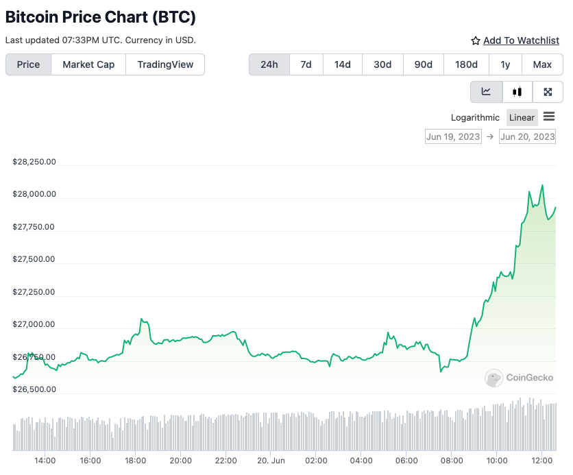 바이낸스와 코인베이스의 미국 증권거래위원회(SEC) 제소 이후, 2만 5000달러에 머무르던 비트코인이 3주만에 2만 8000달러를 돌파했다.