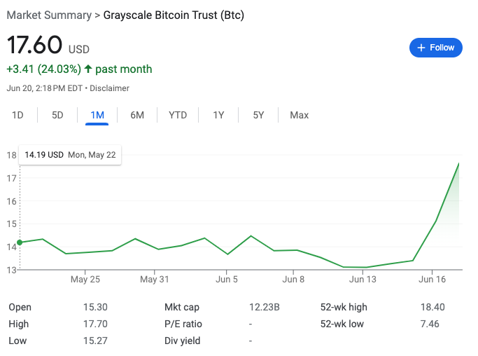 GBTC 주식은 블랙록인 비트코인 현물 ETF를 신청한다고 전해진 지난 15일(13.40달러) 이후, 31% 상승한 17.52달러로 기록했다.