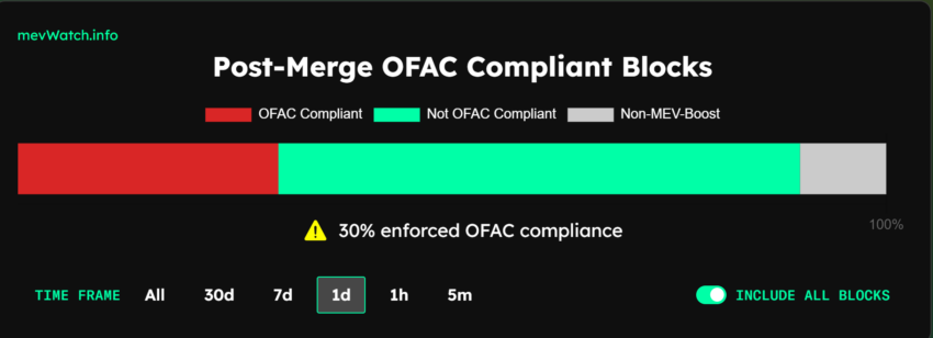 가장 최근 하루 동안 OFAC의 규정을 준수한 트랜잭션 블록 비율. 출처: MEV Watch