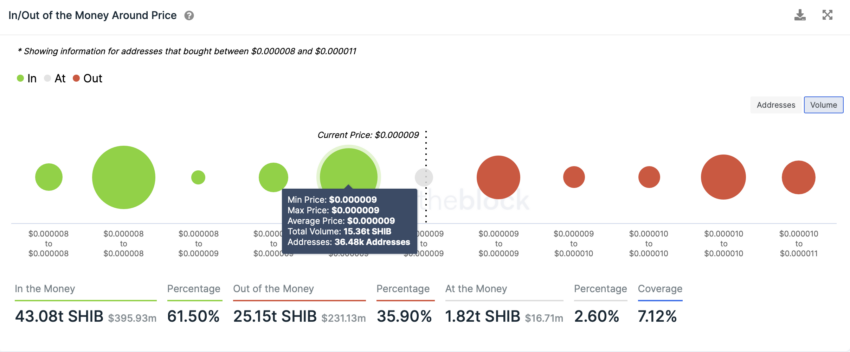 인투더블록의 IOMAP지표는 3만6480개의 주소가 15조 3600억 SHIB를 보유하고 있는 0.000009달러 마크가 현재로서는 강력한 버팀목 역할을 할 수 있음을 시사했다.