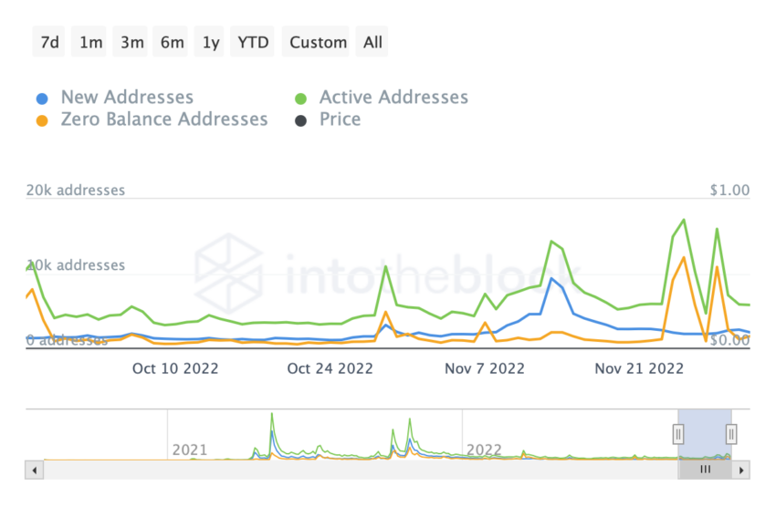 시바이누 일일 활성 주소를 보면, 7일간의 활성 주소가 60.81%의 풀백을 나타내고 있다. 잔고가 0인 주소는 70% 이상 감소한 반면, 새로운 주소는 1.42% 증가에 그쳤다.