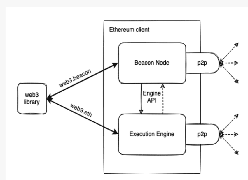 이더리움 더머지 이후, 각 검증인과 표준 노드 운영자는 엔진(Engine) API를 통해 통신하는 합의 및 실행 클라이언트 소프트웨어를 운영한다. 다양한 팀이 이더리움의 보안을 개선하기 위해 다양한 프로그래밍 언어로 클라이언트 소프트웨어 코드를 작성하고 유지 관리한다.
