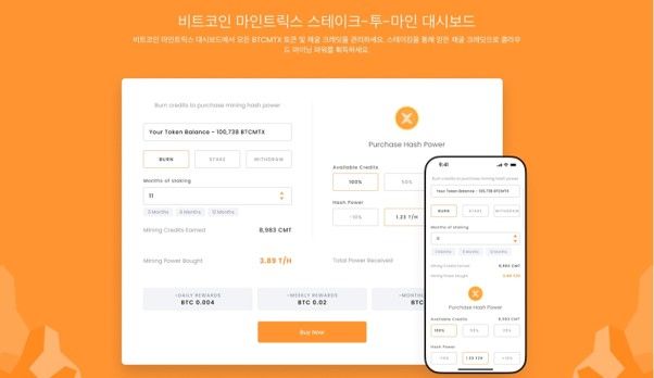 토큰 보유자는 BTCMTX 토큰을 스테이킹해 크레딧을 얻을 수 있으며, 크레딧을 소각하면 클라우드 채굴 파워를 얻게 된다.
