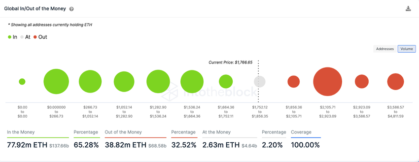 이더리움 가격은 2000달러대에 근접하면서 최소한의 저항에 직면할 가능성이 높다. 이 때는 300만 ETH를 보유한 주소 280만개가 약간의 이익을 얻을 수 있다. 만약 이 매도 구간에서 랠리가 발생하지 않는다면, 2600만개의 주소가 830만 ETH를 매수한 2900달러까지 상승할 가능성이 높다.