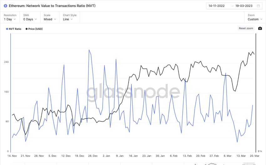 네트워크 가치 대 트랜잭션(NVT) 비율은 강세 논리를 뒷받침하는 또 다른 중요한 온체인 지표다. 3월 19일 현재 NVT 비율은 127.27로 3월 5일 213.75보다 40% 감소했다. NVT 비율의 하락은 일반적으로 네트워크의 트랙션(traction)이 상당히 증가했으며 토큰이 저평가되었다는 것을 의미한다.