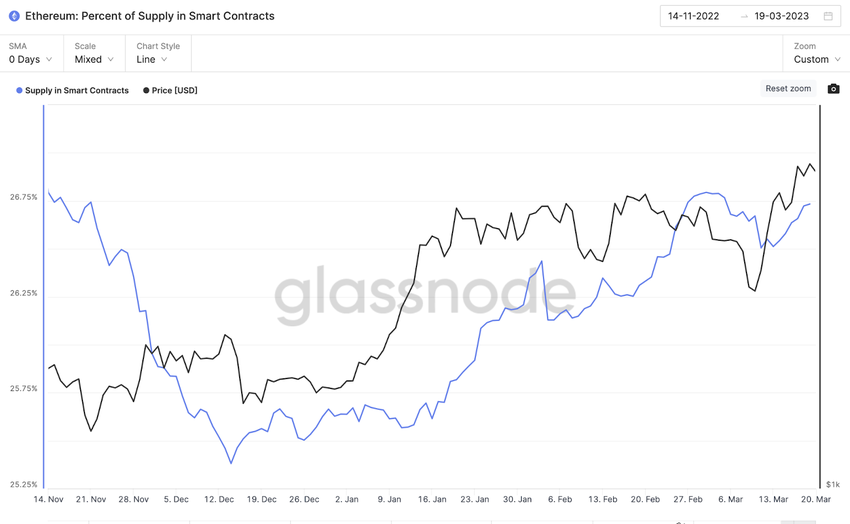 글래스노드의 온체인 데이터를 보면, 디파이에 잠긴 이더리움 공급량이 급증했다. 실리콘밸리 은행이 붕괴한 며칠 후인 3월 13일, 그 전 일주일 동안 하락세를 보이던 이더리움은 상승세로 돌아섰다.