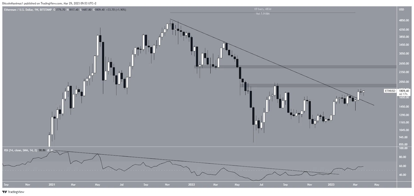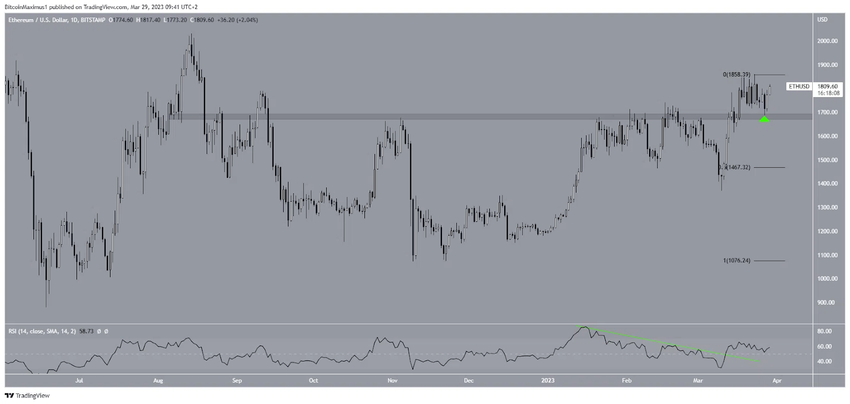상승세가 지속된다면 ETH 가격은 최소 2000달러까지 올라갈 수 있다. 하지만 1685달러 이하로 마감되면 1465달러로 0.5 피보나치 되돌림 수준으로 떨어질 수 있다.