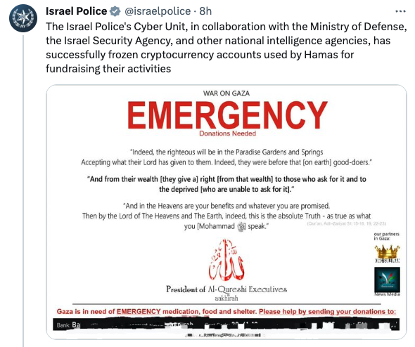 칼칼리스트 보도에 따르면, 이스라엘의 라하브 433 경찰 사이버국은 바이낸스가 하마스 관련 계정을 폐쇄하는 데 도움을 줬다고 10일(현지시각) 발표했다.