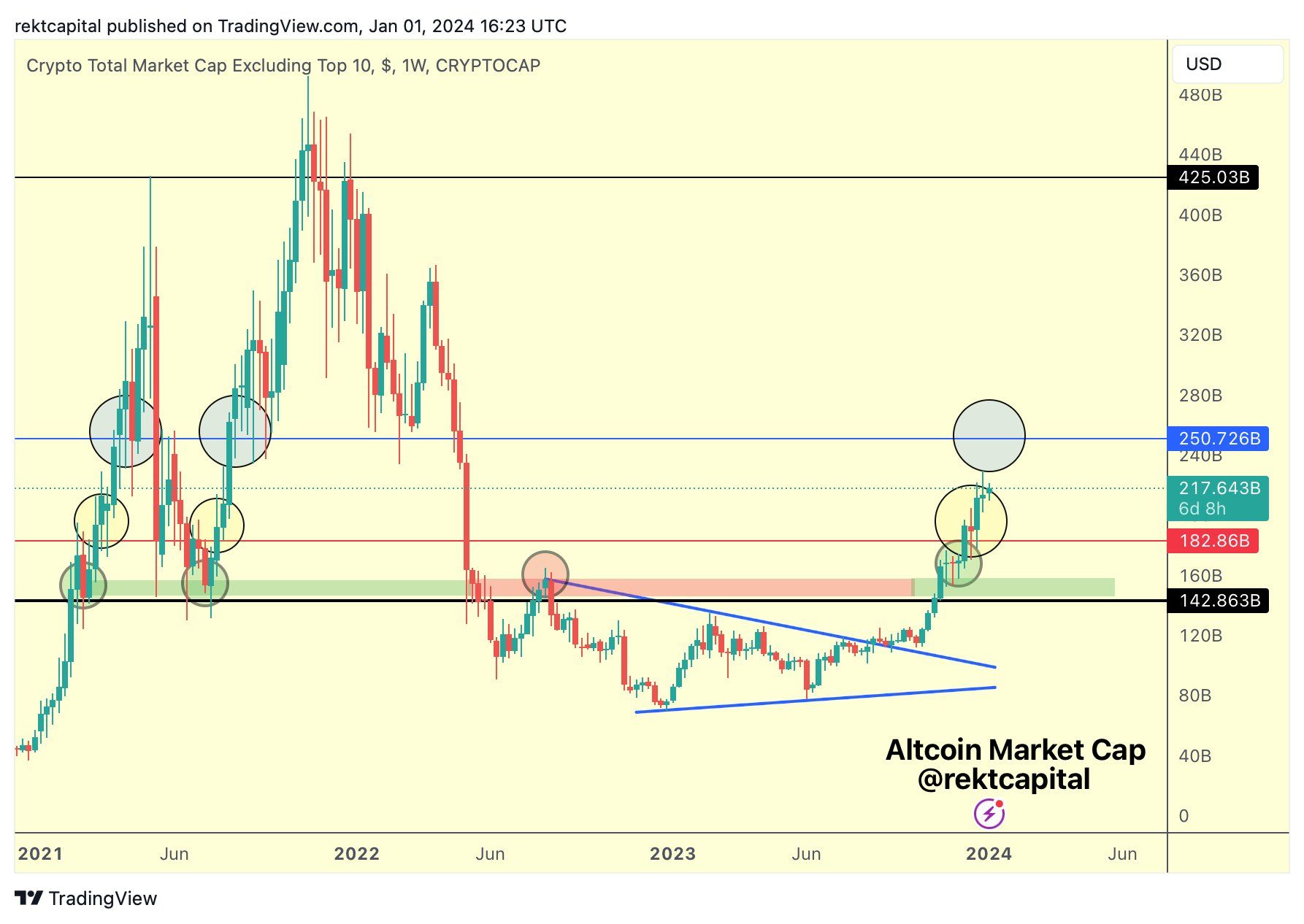 1월 1일, 암호화폐 분석가 ‘렉트 캐피털’은 과거 재테스트 패턴을 관찰하여 알트코인 시가총액의 성과를 기술적으로 살펴봤습니다.
