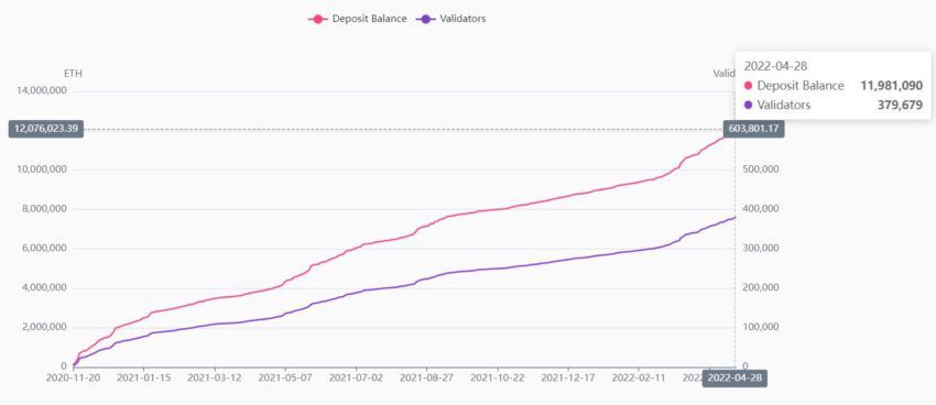 고려해야 할 또 다른 중요한 변수는 최근에 지연된 ‘머지(Merge)’의 타임라인 전에 스테이킹된 ETH이다. 1분기 ETH 지분은 1090만명으로 전년 동기 520만명 대비 111% 증가했다. 이더스타(EthSta)에 따르면, 비콘 체인에 연결된 총 ETH는 1200만개가 넘는다.