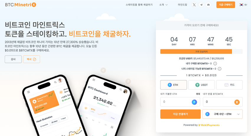 비트코인 마인트릭스 사전 판매는 벌써 540만 달러 이상을 모금했으며 비트코인 마인트릭스 공식 웹사이트에서 참여할 수 있다. 현재 1 BTCMTX당 토큰 교환비는 0.0123 달러다. 4일 후 다음 단계에 진입하면 가격은 인상될 예정이다.