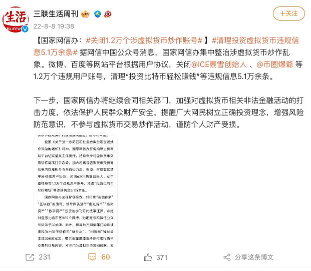 • 앞서, 사이버공간관리국도 웨이보와 바이두의 암호화폐 계정을 무더기로 삭제했다