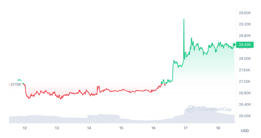 비트코인은 지난주에 2만 6500달러와 2만 7500달러 사이의 좁은 거래 구간에서 거래되다가 잠시 3만 달러 근처까지 상승했다. 하지만 이내 하락한 후 현재 2만 8000달러대에 안착했다.