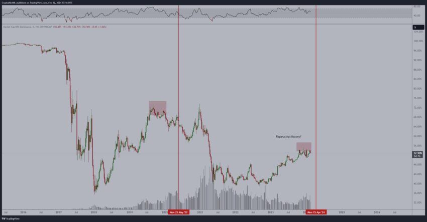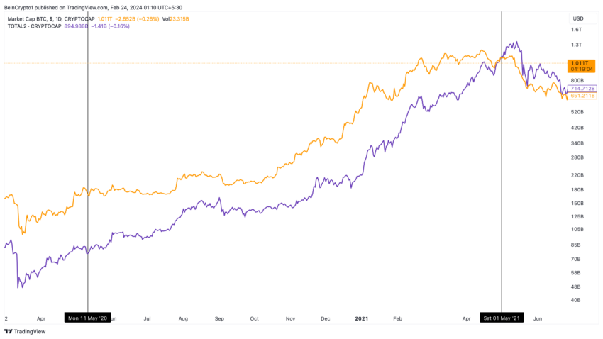Sponsored마찬가지로 올스제비츠는 과거 주기에서 관찰된 패턴을 지적했습니다. 비트코인을 제외한 알트코인의 총 시가총액은 반감기 이후 비트코인의 시가총액을 따라잡고 능가하는 경향이 있습니다. 이러한 현상은 암호화폐 시장 내 투자자 심리와 자본 배분의 변화를 보여주기 때문에 중요한 의미를 갖습니다.