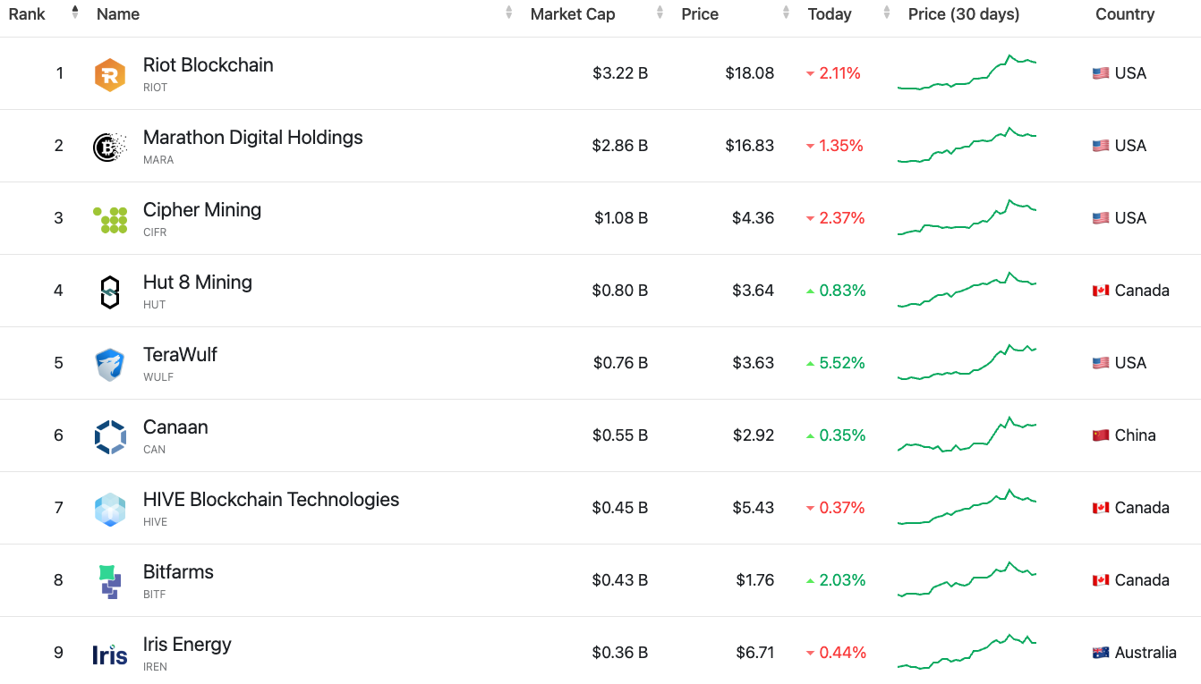 주식 시장에 상장된 상위 9곳의 비트코인 채굴 기업의 시가총액은 올 초에 비해 257%나 증가했다. 시가총액 1위 라이엇 블록체인은 가격 저점을 형성하던 연초에 비해 시가총액이 무려 470%나 증가해 32억 3000만 달러를 기록했다. 마라톤 디지털 홀딩스는 연초 대비 617% 성장한 시가총액 28억 600만 달러를 나타냈다. 사이퍼마이닝(Cypher Mining)도 686% 성장해 시가총액이 10억 달러에 달했다.