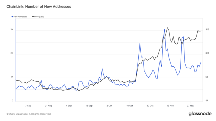 첫째, 체인링크 네트워크가 인상적인 속도로 성장하고 있습니다. 9월 초부터 새로운 주소가 지속해서 등장해 상당한 거래를 하고 있습니다. 5일(현지시각) 비인크립토의 분석에 따르면, 일일 467개에 불과하던 새 주소가 3개월 만에 3044개로 늘어났습니다. 무려 650% 증가율을 기록했습니다. 이는 사용자의 체인링크 네트워크 채택이 점점 늘어나고 있으며, 이에 따라 코인 가격도 동반 상승했다는 것을 의미합니다.