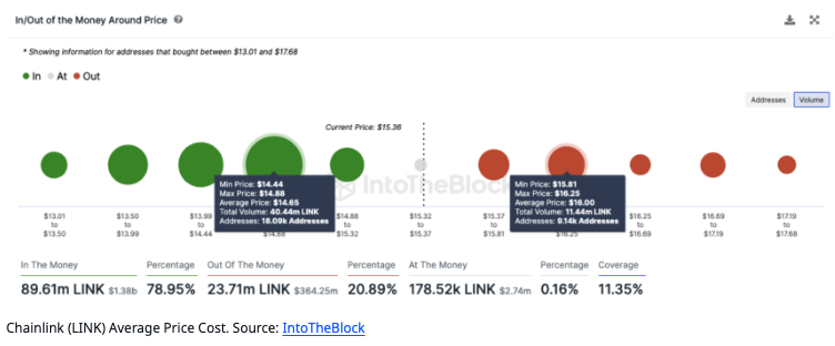 시장에 주는 영향: 암호화폐 분석 기업 인투더블록의 ‘인/아웃 오브 더 머니 어라운드 가격(IOMAP⋅In/Out of the Money Around Price)’ 모델에 따르면, 체인링크는 중요한 저항선에 부딪혀 있습니다. 이 가격 저항선은 15.8달러에서 16.3달러 사이로, 이전에 주소 9140개가 LINK 1140만 개 이상을 매입한 구간입니다. LINK가 20달러를 돌파하려면 이 구간을 돌파해야 합니다.