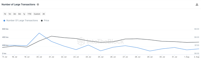 LINK 고래들은 7월20일 527건의 대규모 거래를 수행했다. 그러니 이후 활동량은 서서히 줄어 8월2일에는 78% 감소한 139건을 기록했다.