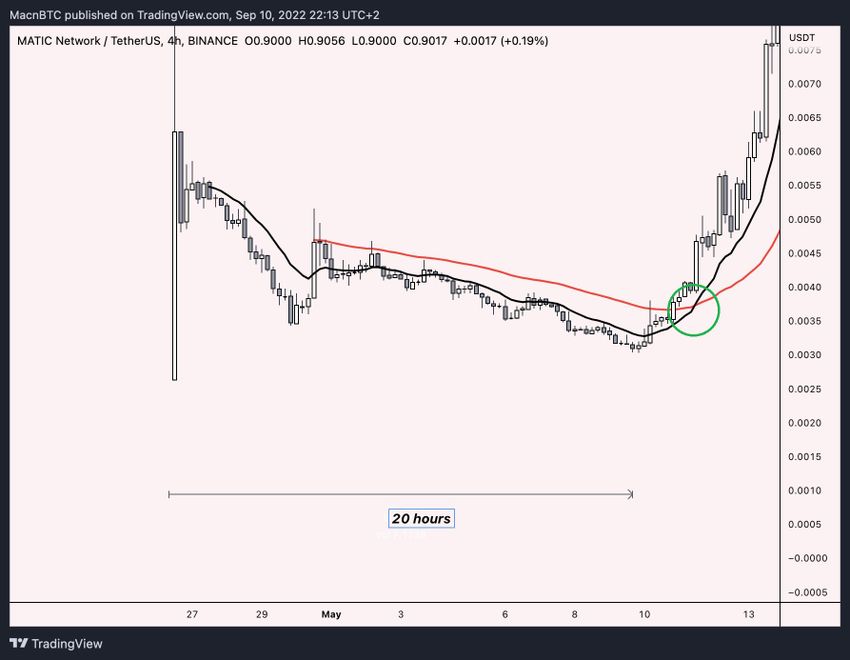 이 두 가지는 모두 MATIC에서 볼 수 있었다. 상장 후 MATIC는 약 20시간 동안 하락했다. 이어 단기(빨간색)와 장기(검은색) MA가 강세 십자가(녹색 아이콘)를 만들자 가격이 크게 올랐다.