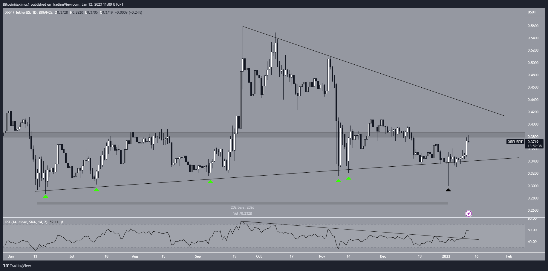 지속적인 가격 상승으로 인해 RSI(상대강도지수)는 하강 저항선(검정색)에서 벗어나서 50 위로 반등했다. 이 두가지 모두 강세 추세의 신호로 간주된다. 상승세가 계속된다면 다음 저항 구간은 0.384달러선이 될 것이다.