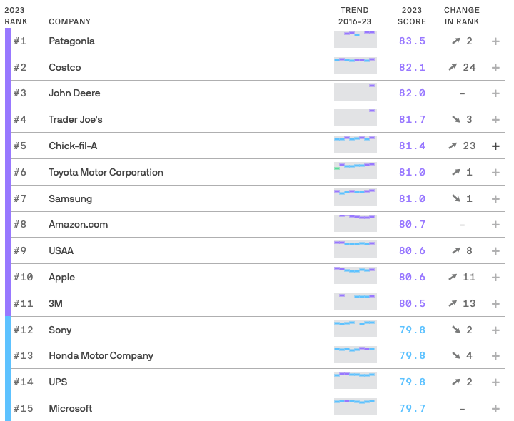 이번 조사는 3월 13일부터 28일까지 미국인 1만 6310명을 대상으로 진행됐으며, 1위는 아웃도어 기업 파타고니아가 차지했다.
