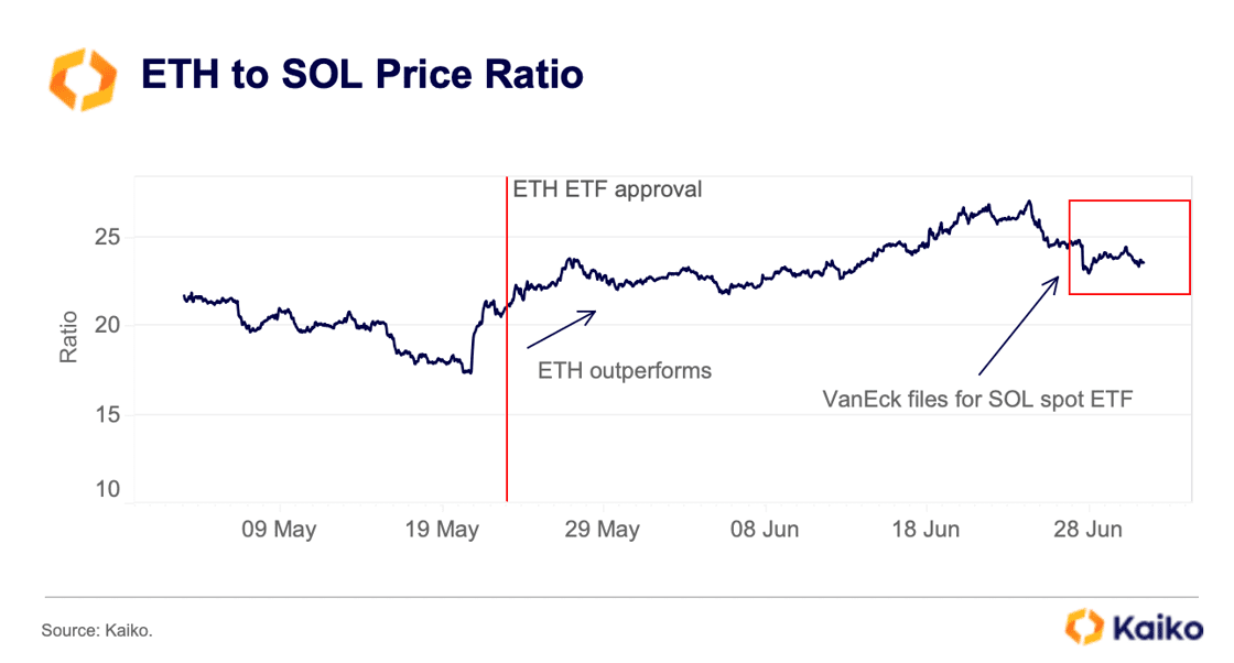 날짜별 추이를 보면, 지난 5월 23일 이더리움 현물 ETF 부분승인 이후 이더 가격은 솔라나 대비 더 좋은 상승세를 보입니다. 투자자들의 높은 선호도가 매수세로 나타난 셈입니다. 27일 즈음 반에크가 ETF를 신청했다는 뉴스가 나오자 이 흐름은 뒤집힙니다. 그러나 얼마 가지 못하고 3일 정도 후에는 다시 이더리움에게 시장 주도력을 내주는 것을 확인할 수 있습니다.